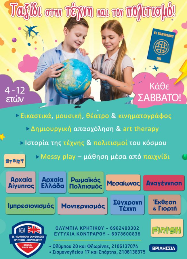 Με οδηγούς τη φαντασία και την καλλιτεχνική έκφραση, τα παιδιά γνωρίζουν την ιστορία της τέχνης, συμμετέχουν σε εικαστικά, μουσική, θέατρο, κινηματογράφο, καθώς και σε δραστηριότητες που συνδυάζουν τη μάθηση με το παιχνίδι!